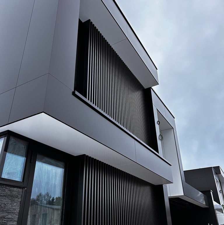 Mes dirbame su įvairiomis fasadų sistemomis ir medžiagomis: aliuminio kompozitu, HPL, fibrocementu, keramika, natūraliu akmeniu (skalūnas, granitas, marmuras, smiltainis), mediena, termo mediena, medžio kompozitu, skardinėmis apdailomis, aliuminio plokštėmis, vario apdaila, kortena.
